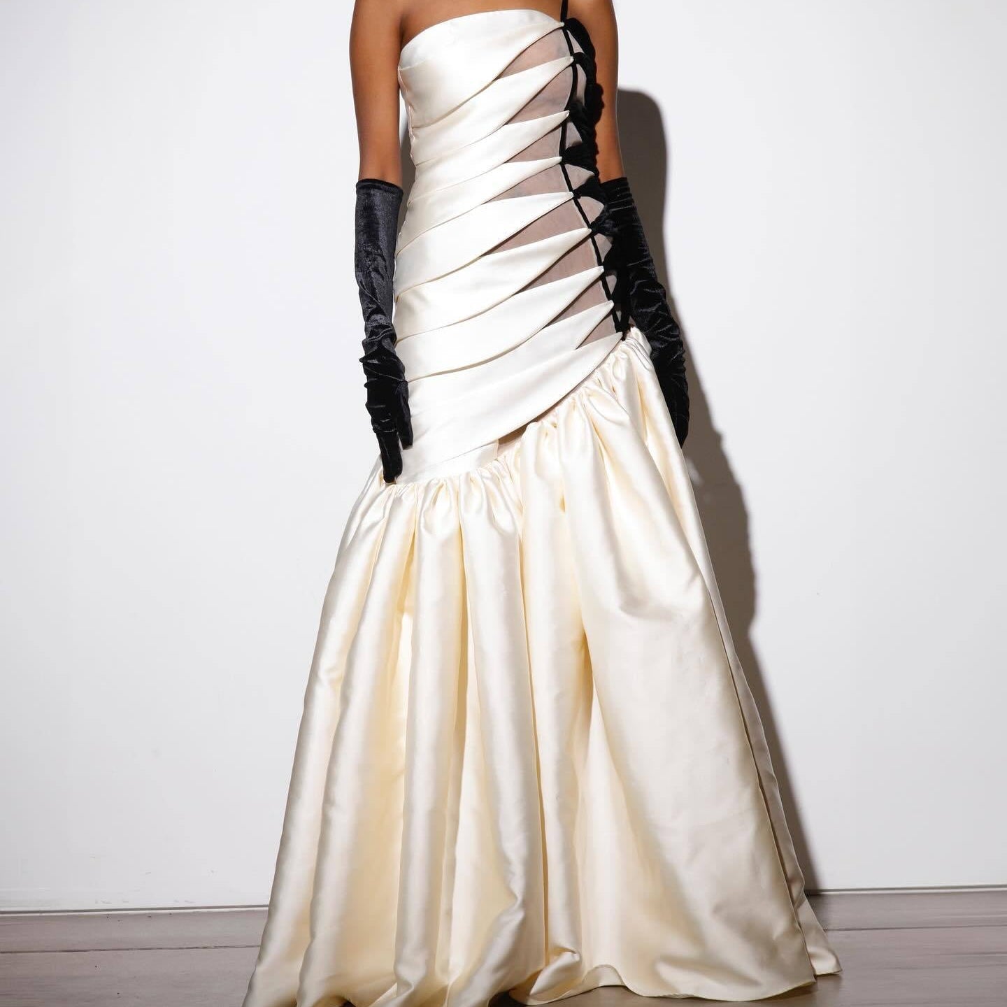 Make a runway-worthy impression—pull hair into a sleek ponytail, pair with statement heels, and finish with bold cuffs or bangles to echo the gown’s striking geometry.