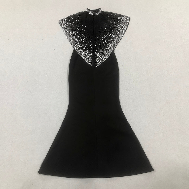 Keep accessories minimal—pair with crystal drop earrings, metallic heels, and a sleek clutch to let the cape’s sparkle and silhouette shine.