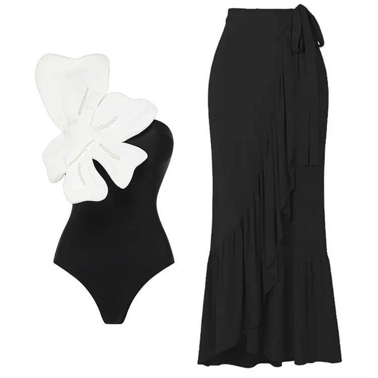 The Jill Strapless 3D Floral One Piece Swimsuit & Asymmetrical Ruffle Cover-Up, a captivating swimwear set that exudes elegance and modern flair. This sophisticated ensemble features a stunning strapless one-piece swimsuit adorned with 3D floral embellishments, paired with an asymmetrical ruffle cover-up that adds a touch of drama and style. Perfect for any beach or poolside occasion, the Jill set ensures you look effortlessly chic and feel confident in the sun.