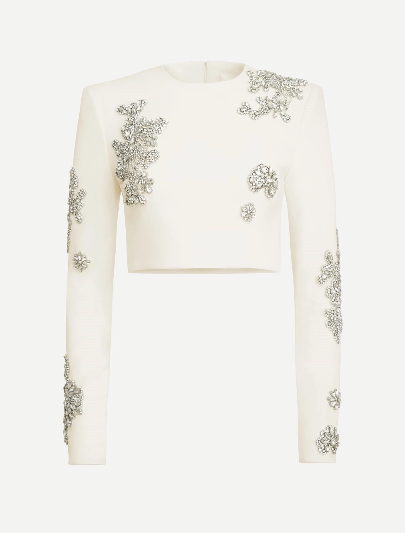 Rhinestone-studded long sleeve crop top for high-shine drama