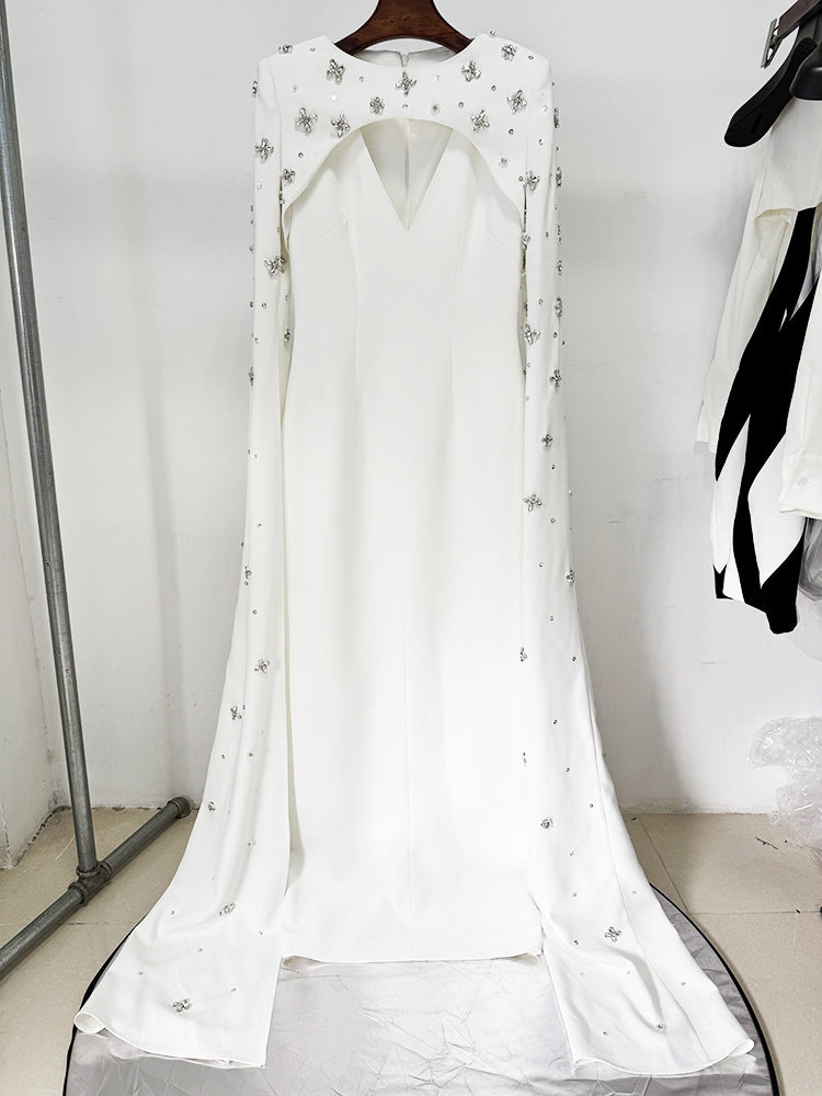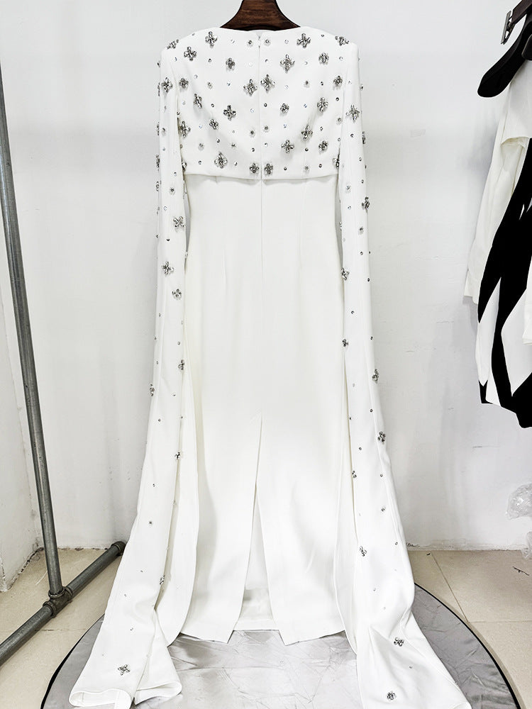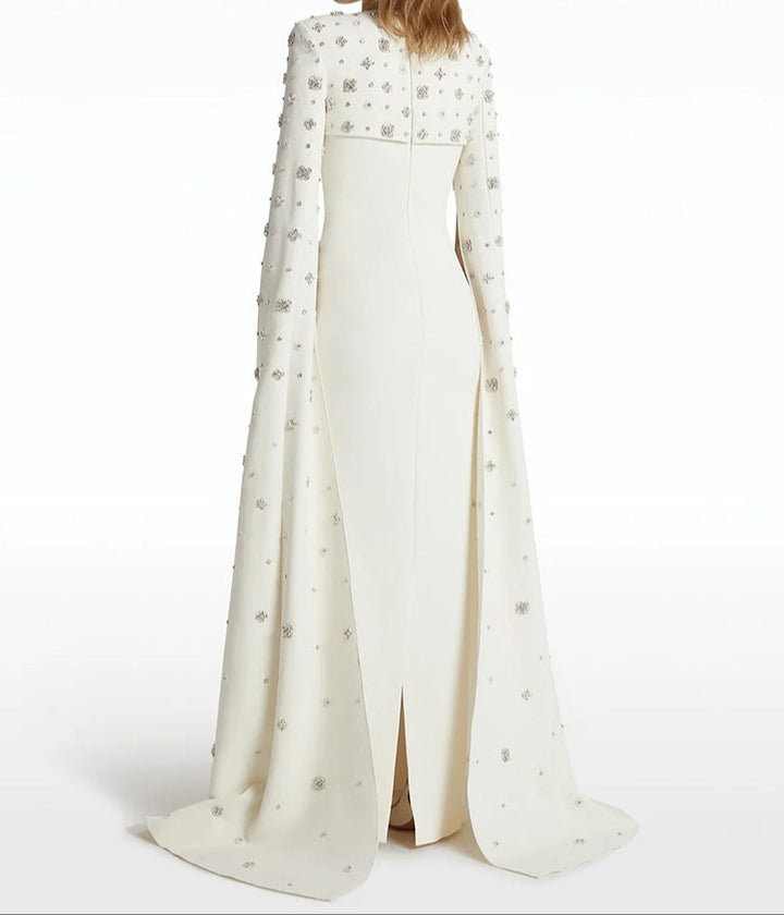 Step into timeless sophistication with the Opal Crepe Beaded Cape Sleeves Dress. Designed to dazzle with subtle drama, this gown features stunning crystal-beaded cape sleeves that flow beautifully with every movement. The sleek crepe fabric skims the body in a flattering mermaid silhouette, making this piece a showstopper for formal events, black-tie affairs, or elegant evening soirées.