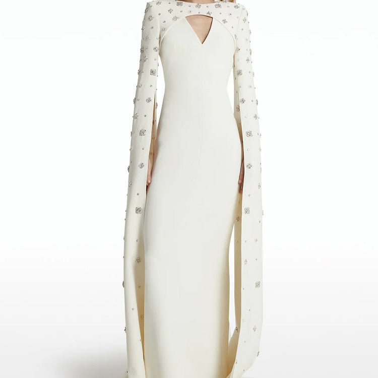 Elegant Grace: Hot Fashionista Opal Crepe Beaded Cape Sleeves Dress