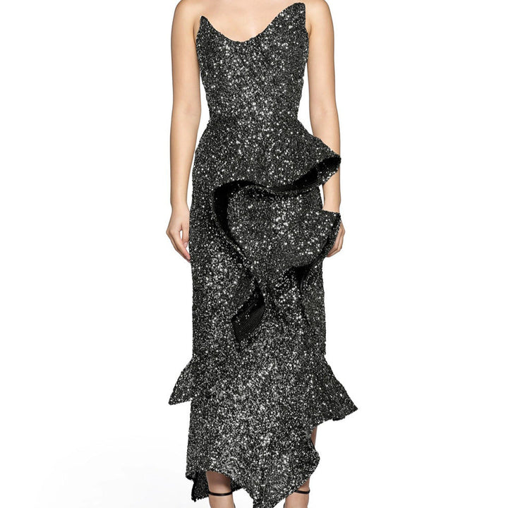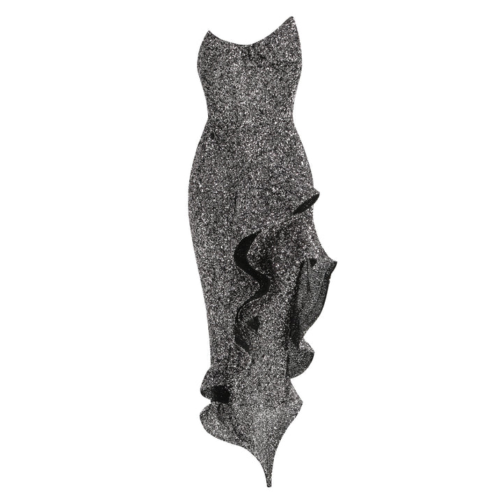 Make your entrance unforgettable in the Phoenix Thistle Wave Ruffled Sequined Midi Dress. Designed to dazzle, this show-stopping dress is a masterpiece of texture, shimmer, and sculptural elegance. Featuring cascading ruffled details and wave-like sequin embellishments, it brings movement and shine with every step.